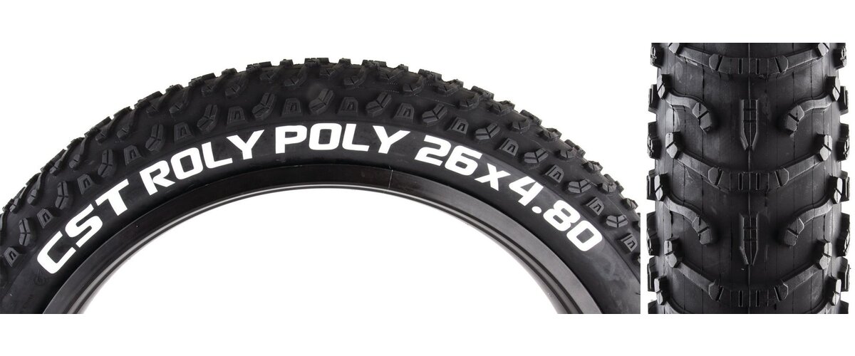 Bigger, better and more brutal: Fly over loose terrain and snow with CST’s first fat bike tire. The Roly Poly’s center knobs are designed to deliver low rolling resistance, while the large side knobs make cornering a breeze.