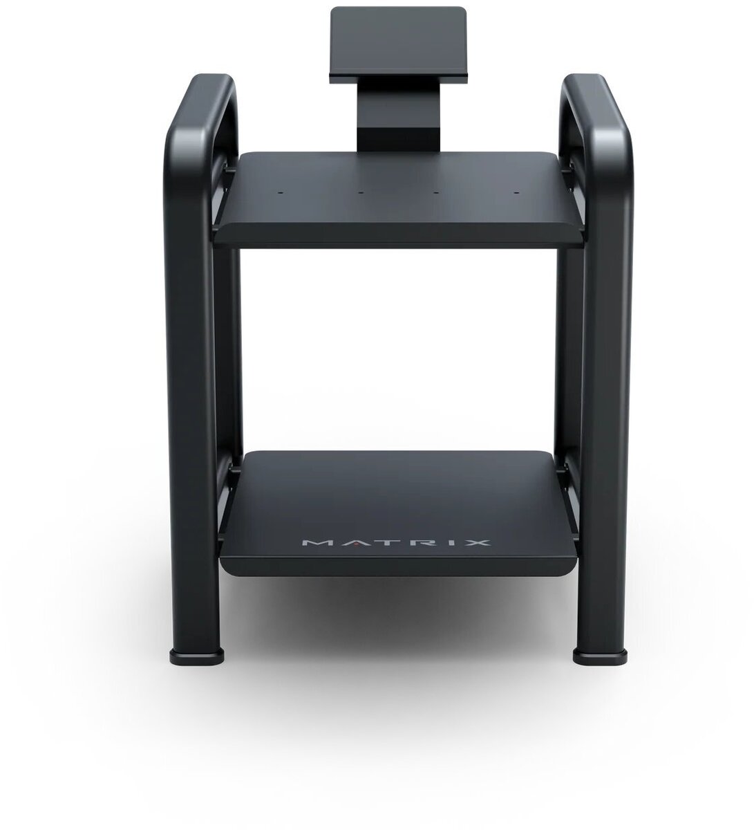 This optional storage rack elevates dumbbells for easy access and to reduce clutter. An integrated device holder makes it easy to keep workout programs and entertainment in view, while a lower storage shelf makes room for accessories like bands, mats and more.
